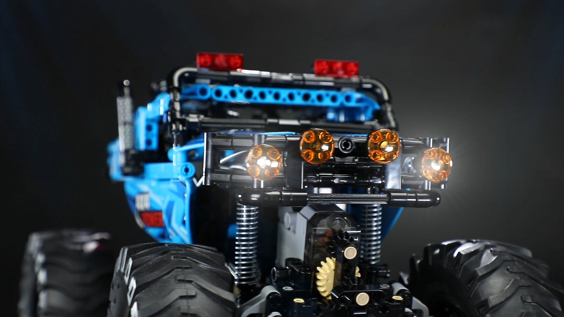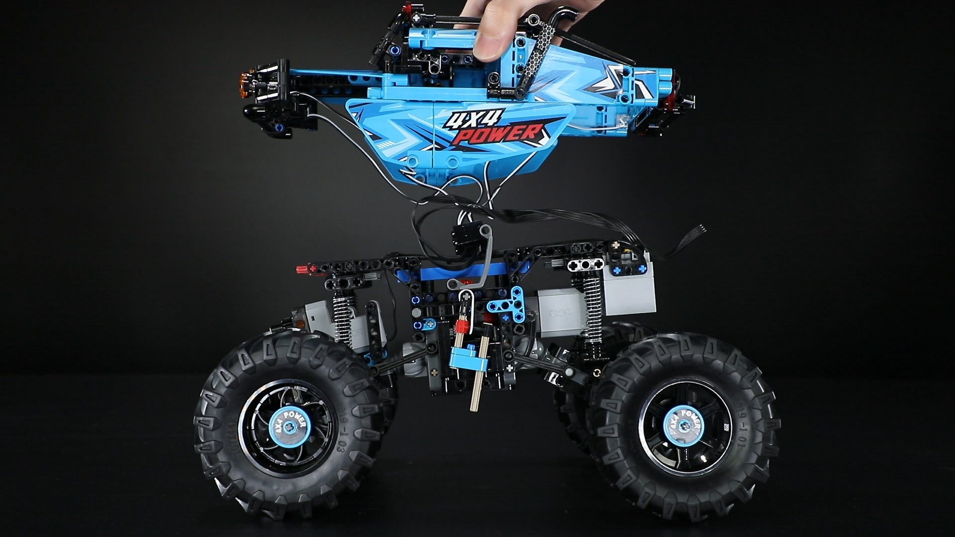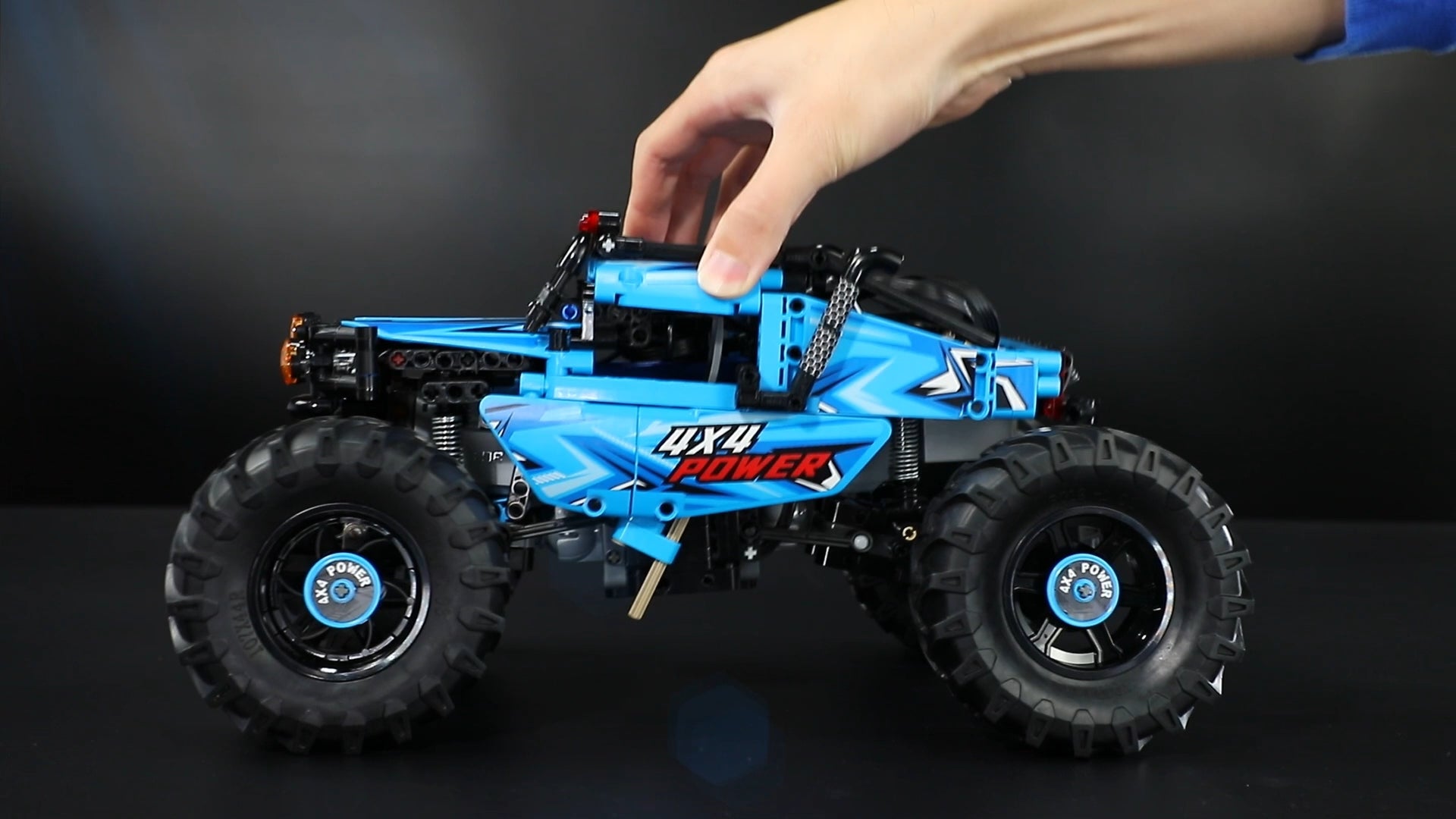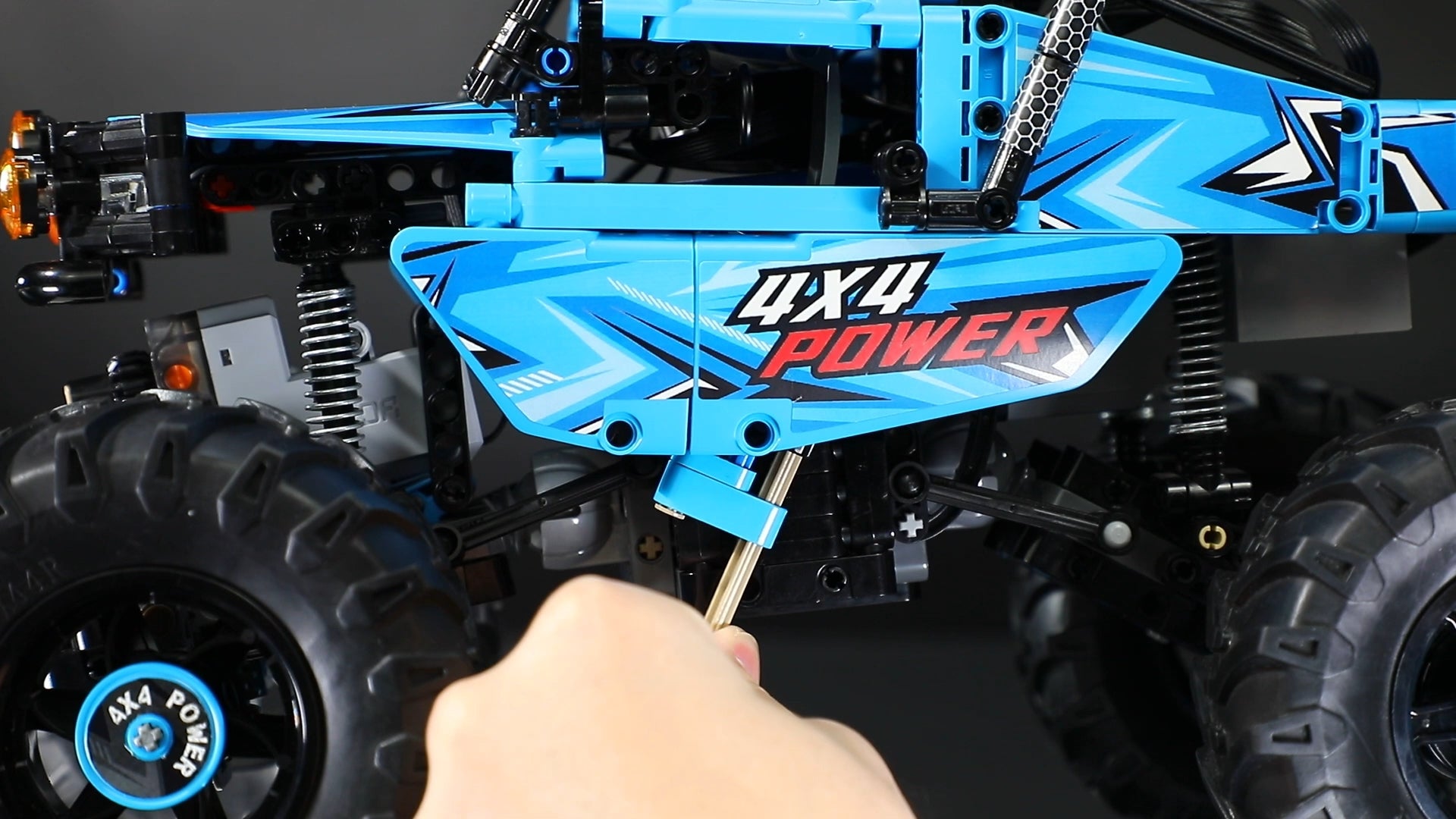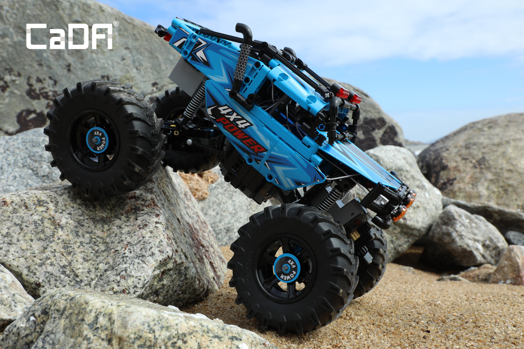 CaDA C61008W is a 4x4 cool looking off-roader with impressive features and performance. This authentic CaDA truck features blue, white and black color schemes with an aggressive looking truck front. The truck consists of 699 pieces and that makes it a great option not only for the advanced builders but also for those who have just stepped into this exciting hobby. The set comes in motorized version with new CaDA Pro series power function elements: one Pro series L size motor, one Pro series Servo, two LED lights and a battery box with transmitter. The sturdy construction comes with a high rise independent suspension and large wheels with soft tires combined with an all-wheel drive system. As this set is not only for indoors play, CaDA R&D team has also thought about those pieces which can take lots of impact. The truck is armed with 2 metal Cardan joints inside the ball joints and 4 carbon fiber axles to reinsure the stable performance of the chassis. These practical solutions will make you look for new off terrain crawling challenges. Different track conditions requires different speeds, so you can choose between low and high speed modes. The speed mode switch is controlled manually. For more convenience, the truck's body can be removed in couple of seconds as it is attached to the truck with 2 pins - easy and fast. In addition to all cool features, the truck is equipped with working front and rear LED lights.